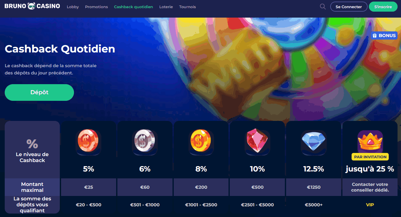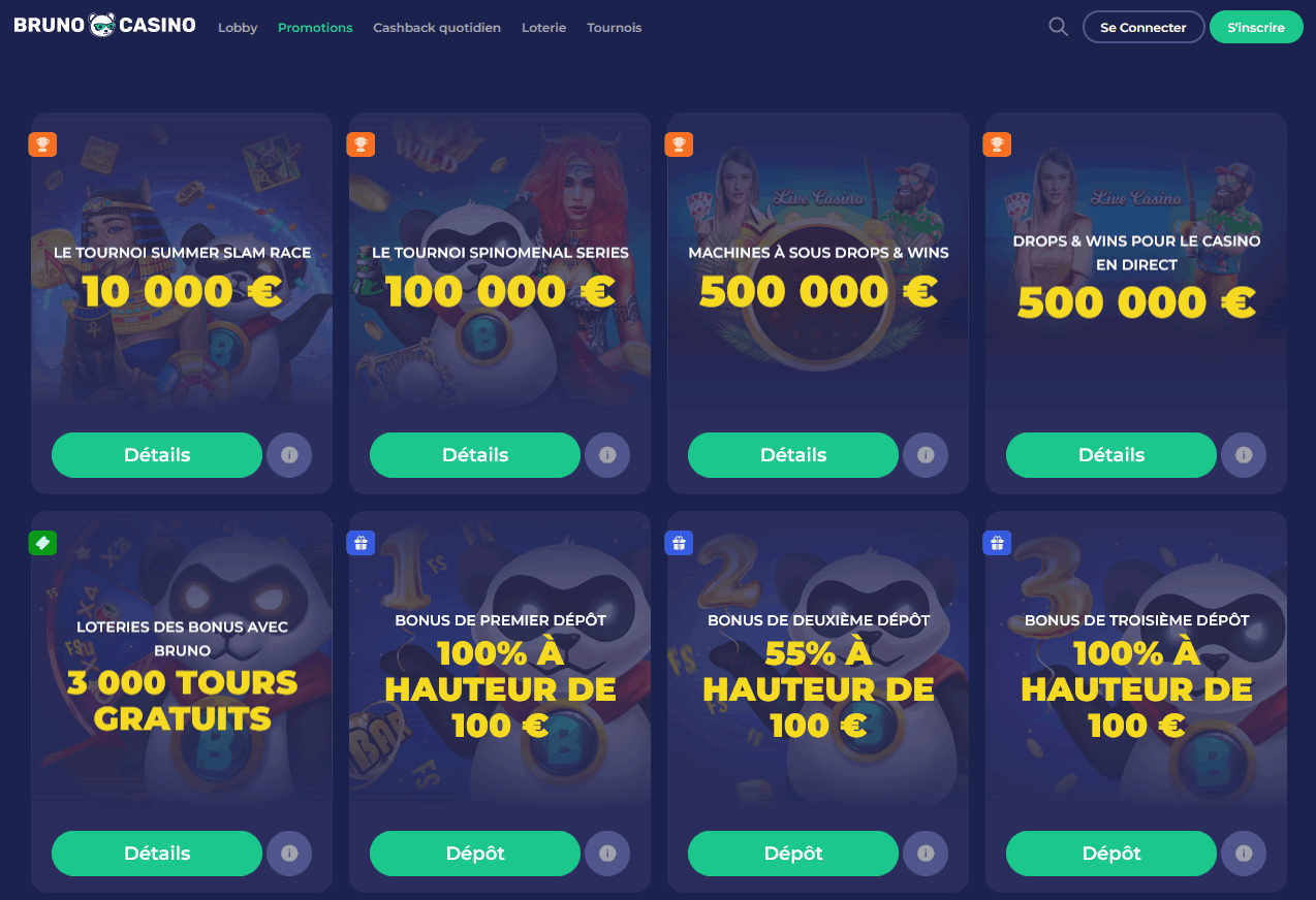 - Certaines offres comprennent le bonus de bienvenue, cash back, des spins gratuits, et des tournois avec de gros prix en espèces. Vous pouvez accéder aux promotions en cours par l’onglet promotions sur le site de paris. Bonus viennent avec des exigences qui doivent être remplies. Maintenant, nous allons discuter de certaines des offres uniques disponibles à Bruno Casino.